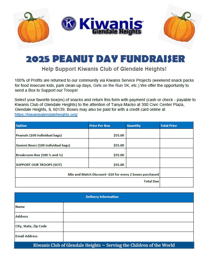 Kiwanis of Glendale Heights is asking for your support. Please consider supporting Peanut Day by purchasing Peanuts and/or Gummy Bears. All profits support youth in Glendale Heights.